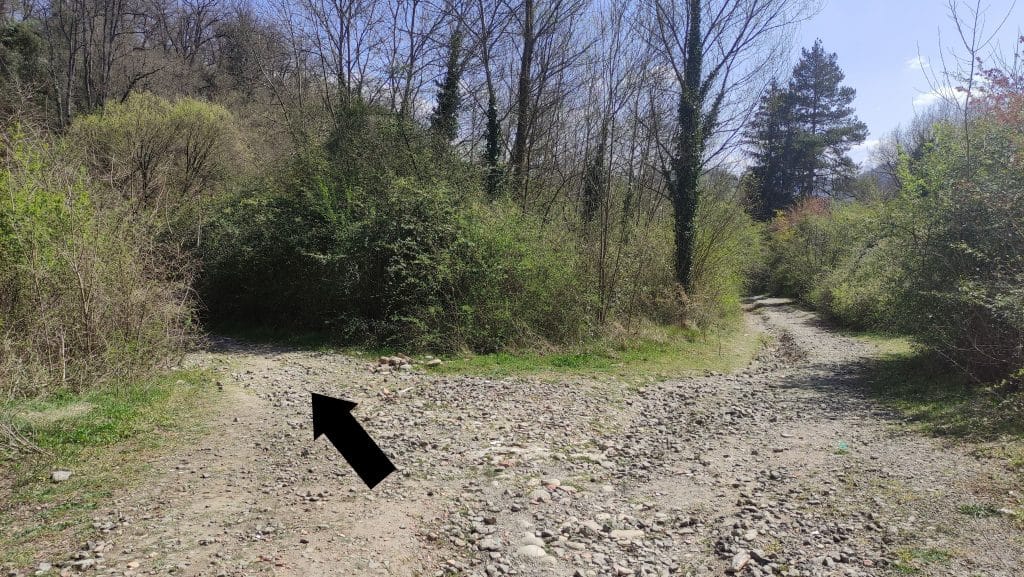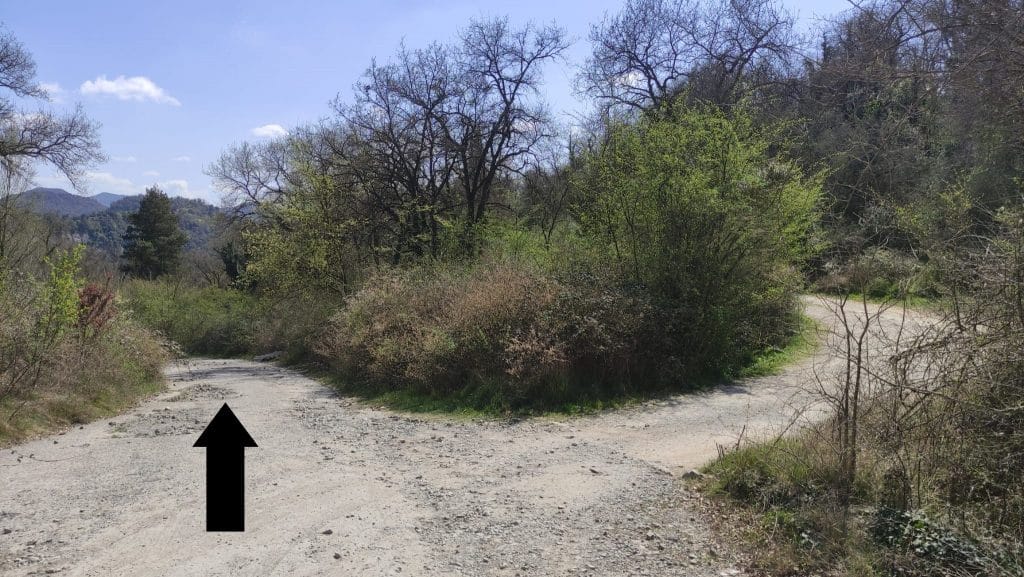 Dejando el campo de fútbol a tu izquierda, sigue recto hasta el sendero sin asfaltar. La primera bifurcación que encuentres sigue recto, el desvío a la derecha te lleva hasta una pequeña urbanización.
